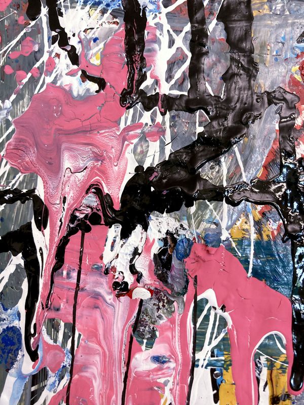 The paintings worked on within this period (end of 2020 to the spring of 2021) return to my "paint is more" technique which I can best describe as not starting with a particular vision and loading paint to the canvas until something emerges. These canvases have many layers of paint, which are peeled, heated, sprayed with water, and repainted multiple times. I remember thinking about the cotton candy I would buy during the local street fair in Columbiana, Ohio when I was a young teen while watching the pink paint drip. Street fairs are sweet and dirty at the same time, much like this painting.
