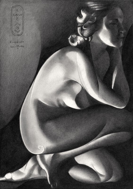 Once Again Once in a while I get that itchy feeling again that makes me want to turn to roundism. The last one by that title I made half a year ago. In between lie an odd couple of Geesje Kwak and Risque drawings. After the aforemeant last one I thought I was through with that style. Never say never again is what I experience as an artist though, over and over again. Now I see that the only thing that I have to do is to let it go sometimes. Do something else instead. Thinking and planning in series made me force to abandon a succesful style or series, in order to grow. Who knows what the tide may bring after a while. A Smashing Picture The love for textures in kimono’s (Geesje) and fur (Risque) has brought me to new insights. That was when I saw this incredible 1930s picture drifting by all of a sudden It seemed the opportunity was too good to let it pass by. Just like last time I didn’t catch the photographer’s name. I thank him or her wholeheartedly for the play with light and dark. It is not hard to imagine where Tamara de Lempicka got her inspiration from. The extreme tonal bandwidth makes everything appear conal. Forms get abstracted automatically, also by the hefty light source coming from the left. It shines right trough the body, lighting up only a tiny part of the lower right under arm for example. Such things are like artistic gems waiting to be plucked by me. Hairy Business The level of abstraction doesn’t differ from the reference picture much. It was a picture with a low resolution. I simply exaggerated some features and sliced them up roundistically. The hair is typical De Lempicka’s and I had ‘The Sleeping Girl (Kizette)’ in mind when I drew the hair in this one. Graphite pencil drawing (Sakura 0.5 mm, Pentel 4B) on Talens Bristol paper (21 x 29.7 x 0.1 cm) - A4 format) Artist: Corné Akkers