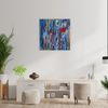 This is a contemporary painting featuring unidentified objects flying between vertical lines. Drawing inspiration from the movie "Walking the Line," the image mirrors its abstract theme featuring symbolic elements such as time passing, love, bubbles of life, flowers of paradise, hopes, struggles, vivid dreams, or crystal bowls. These elements gracefully dance amidst the lines, seemingly breaking free from the confines of the canvas while playfully hiding behind an imaginary tree. The dominant color scheme revolves around blue, setting a tranquil tone for the piece. A prominent red circle captures attention, acting as a focal point with other symbols soaring between the lines. These symbols, adorned in vibrant orange, yellow, green, purple, and brown hues, inject the artwork with dynamic energy and symbolic meaning.