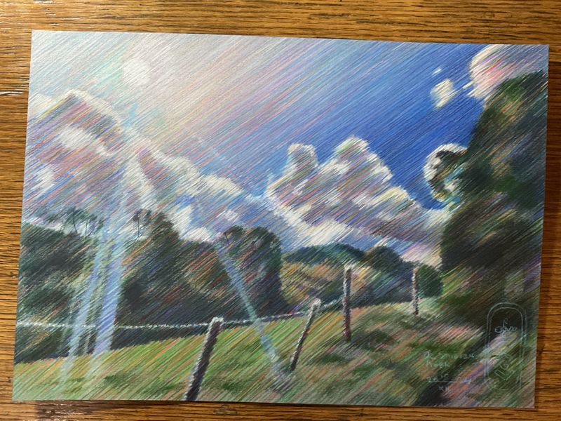 The Second One This colored pencil drawing ‘De Smorenhoek – 15-12-24’ is my next impressionist one after ‘Royal Estate – 12-12-24’. This time in color. This isn’t the first time I did a drawing after the place. The last one was 4 years ago during the Corona crisis. The very scenery wasn’t much known to me actually. I knew it alright. In fact, I have known Beek-Ubbergen for whole my life. Simply because my aunt Drina lived there and we visited her frequently throughout the years. On Rozen-maôndag during Carnaval I remember walking down the Ketedal hearing the music. The Smorenhoek is just on the other side of the Boterberg. An anomaly really because, except for the Elysian Fields. It’s all trees and hills in Beek and Berg en Dal. So there I was a couple of years back, walking down the path with my dad Henk Akkers. Focus on the Clouds The first impression did a lot to me. The sun shone brilliantly and it created lovely cast shadows across the fields. That was some years back. Now in 2024 and still a astonished by my 2nd warning by Youtube (Prude Tube) I made another ‘safe’ drawing. Not a one appearing on the Tube quickly. They banned me and I will bann them for a while. Not that they will notice though.Anyway, I quite liked doing another landscape. In this particular work I focused on the hefty play of dark and light in the clouds really. The greens of the trees in the front and in the back almost look blackish on the picture. However, I remember they weren’t that black at the actual spot. So, I added a lot of red and orangy browns and let them correspond with the the clouds colours. Colored pencil drawing on Talens Bristol paper (21 x 29.7 x 0.1 cm - A4 format) Artist: Corné Akkers
