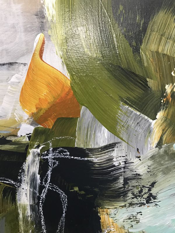 The artwork is an abstract painting featuring dynamic brushstrokes and a vibrant mix of colors. Dominant hues include shades of green, orange, and white, interspersed with dark gray and light blue elements. The composition showcases layered textures and bold, sweeping strokes that create a sense of movement and depth. The interplay of light and dark areas adds contrast and intrigue to the piece.